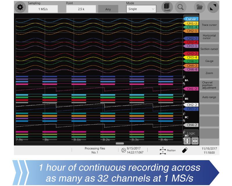 HIOKI MR6000:tta sarjan laitteessa on uuden käyttöliittymän lisäksi erittäin tehokas ja nopea datan tallennus, joka on jopa 32 kertaa nopeampi kuin edeltävissä malleissa. Hitaat kovalevyversiot on korvattu nopeilla SSD-muisteilla.