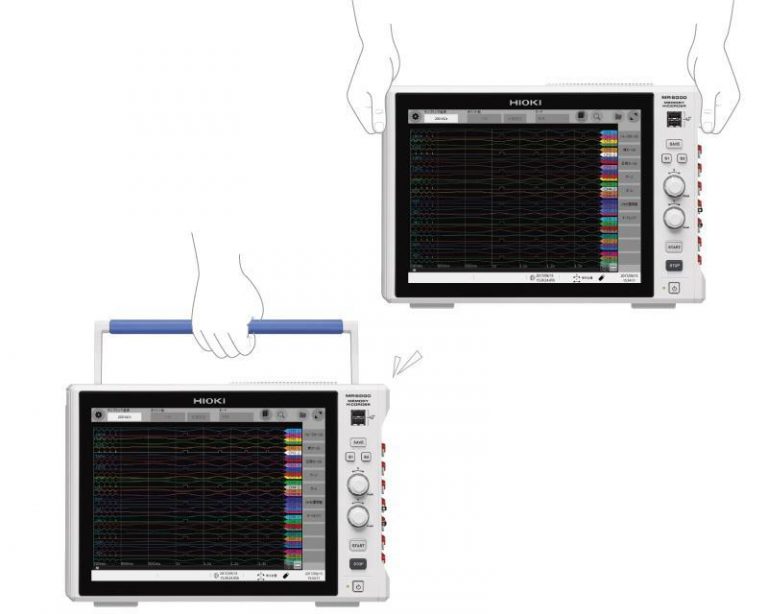 HIOKI MR6000:sta on helppo liikutella ja siirrellä, sillä laitteessa on kumipäällysteiset kantokahvat, joista saa tukevan ja liukumattoman otteen.