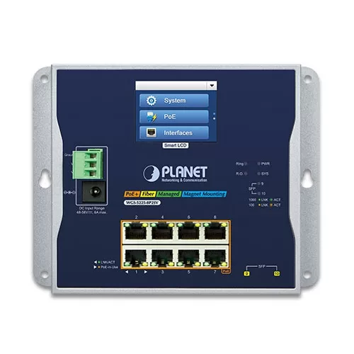 PLANET WGS-5225-8P2SV on teollinen seinään asennettava PoE hallittava kytkin, jossa on LCD-kosketusnäyttö ja PLANET-älykkäät PoE-toiminnot teollisten sovellusten saatavuuden parantamiseksi.